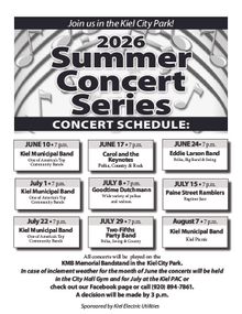 The concerts are located in the Kiel City Park, 417 Paine Street, and are sponsored by the Kiel Electric Utilities.