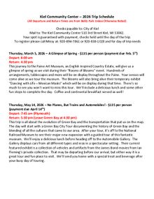 Come join us for fun on the trips we will be taking in 2026! We always depart from the Belitz Park parking lot in Kiel (just off of Cemetery Road) and ride on a spacious coach bus to our destinations. These trips are open to anyone and to all ages. For questions please call Missy at 920-894-7861.